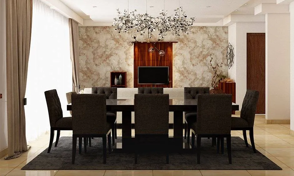 A chandelier or large pendant can transform the dining zone into the visual center of the room. Brass, smoked glass, and sculptural shapes work especially well above black tables.