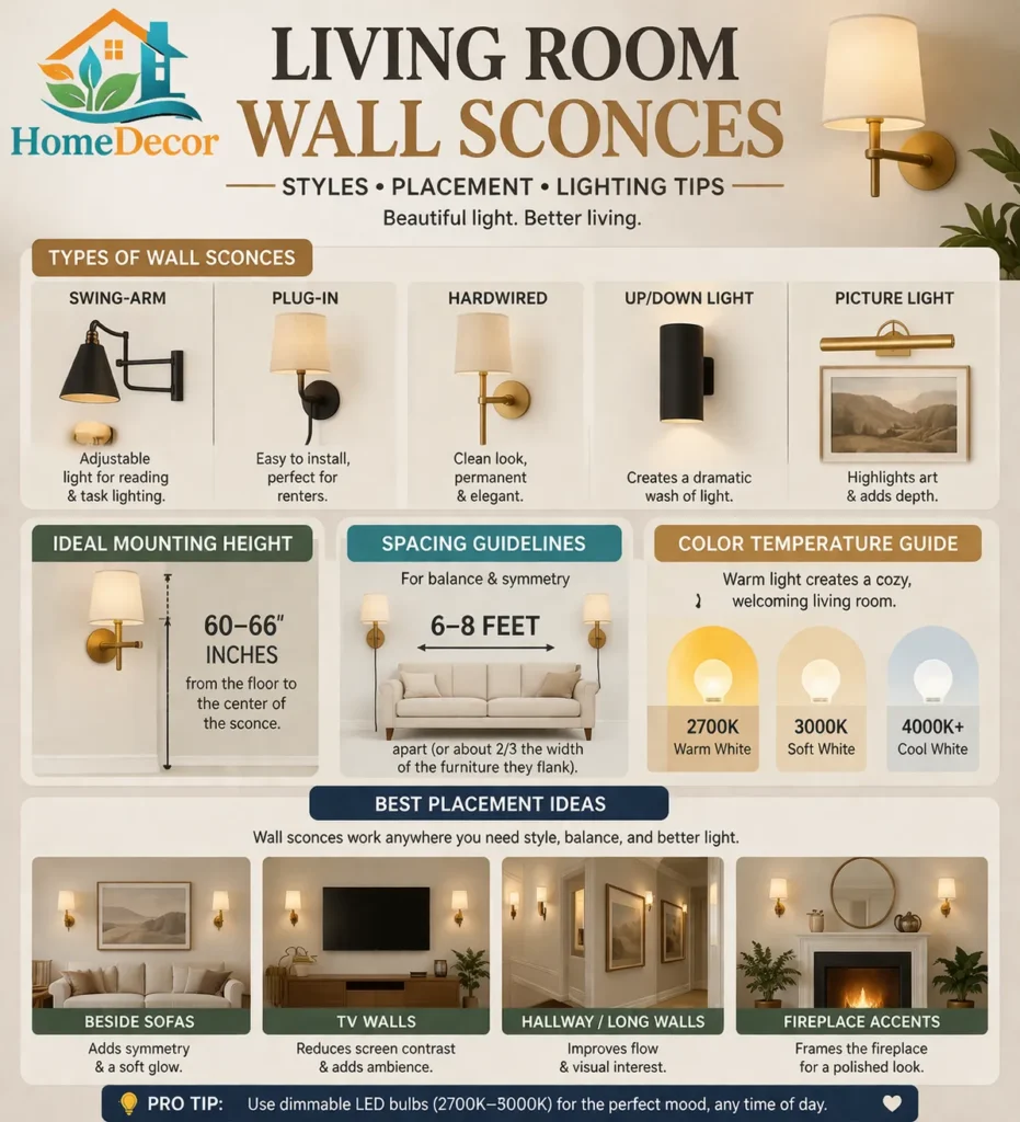 Ambient sconces create a gentle, even glow that makes a living room feel calmer. They are ideal for evenings when you want the room to feel soft and restful. These fixtures are especially helpful in rooms that feel too dark or too empty.