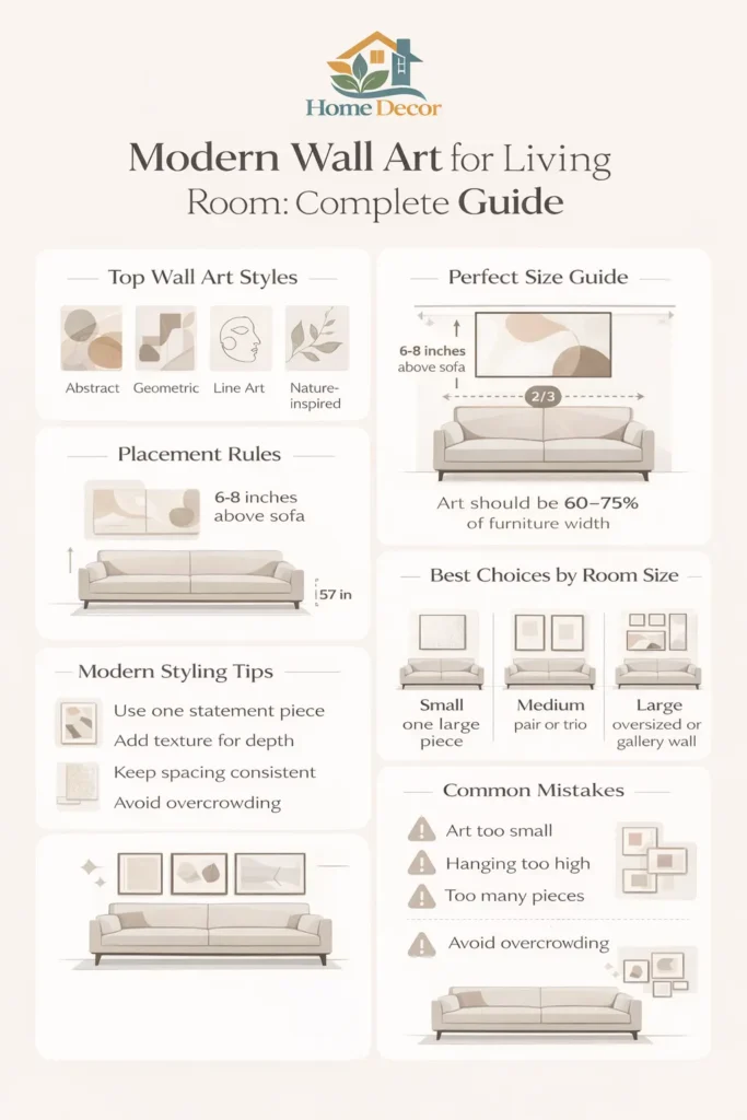 | Contemporary | Oversized canvas, textured pieces, sculptural decor | Creates a strong focal point | Main wall behind seating |