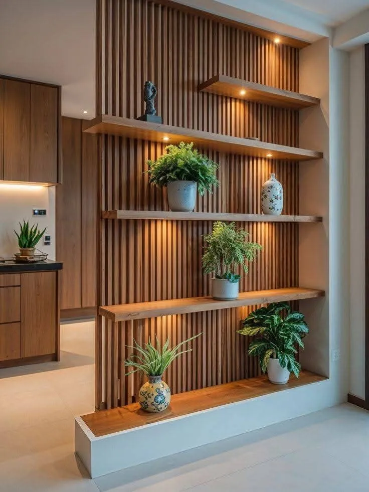 Wooden partitions add warmth, softness, and texture to an interior. They can be simple slat screens, decorative carved dividers, shelving partitions, or custom joinery elements. Wood works especially well when the goal is to define a zone without making the room feel hard or severe.