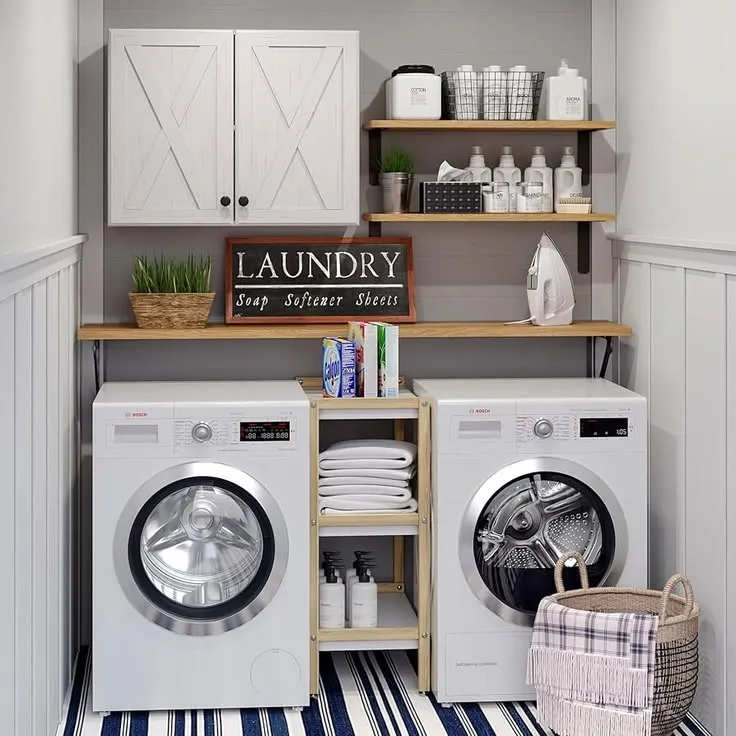 This vertical strategy offers several advantages. In small laundry rooms, it keeps the floor clear, making the space feel larger and easier to navigate. In larger rooms, it creates a cohesive and built-in appearance while improving accessibility.